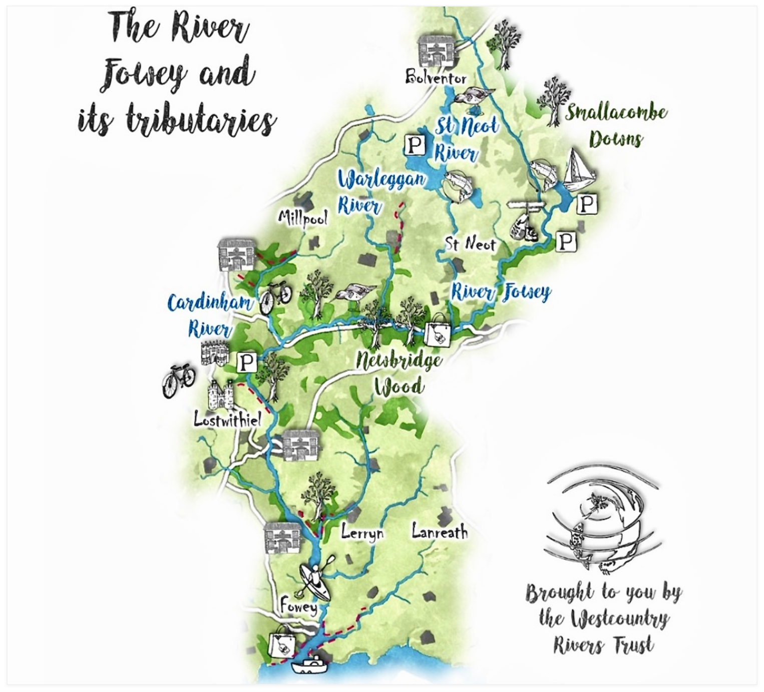 The River Fowey is a prime Cornish spate river rising on Bodmin Moor about 1 mile North-East of Brown Willy and flowing south to the sea at Fowey. It has a catchment of over 65 sq/miles including its tributaries – The Cardinham river, The Warleggan river, The St Neot River, The Trenant stream, The river Lerryn.
